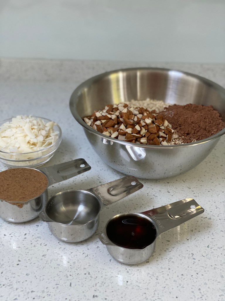 1. Mix the porridge oats, chopped almonds, cacao and salt in a bowl