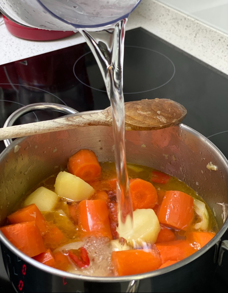 2. Put the EVOO, onions, carrots, potatoes, ginger and chilli in a pot and cook it for few minutes on high flame.