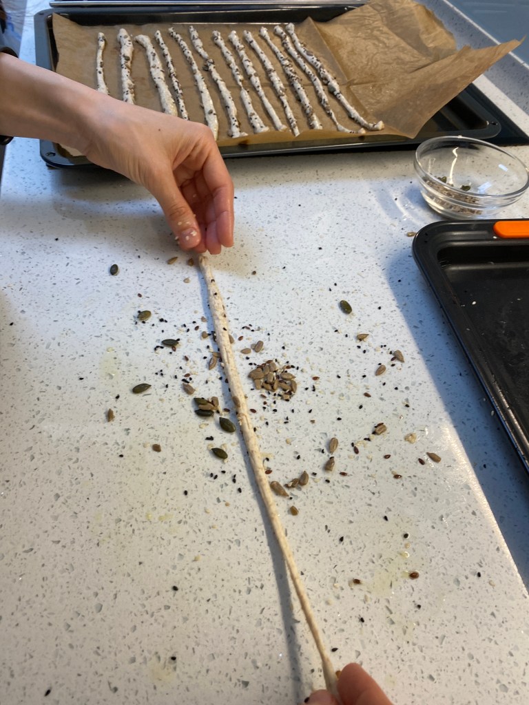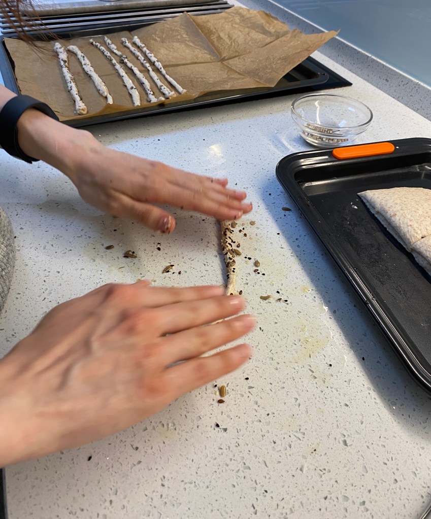 6. Shape the grissini either by gently rolling them on the oiled and seeded countertop or by gently swinging them with both your hands