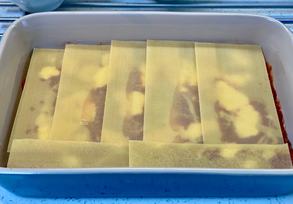 Ready to cook lasagna sheets take a lot of liquid, so make sure you do not overlap the lasagna sheets too much and add plenty of sauce as it will help cooking the lasagna sheets.