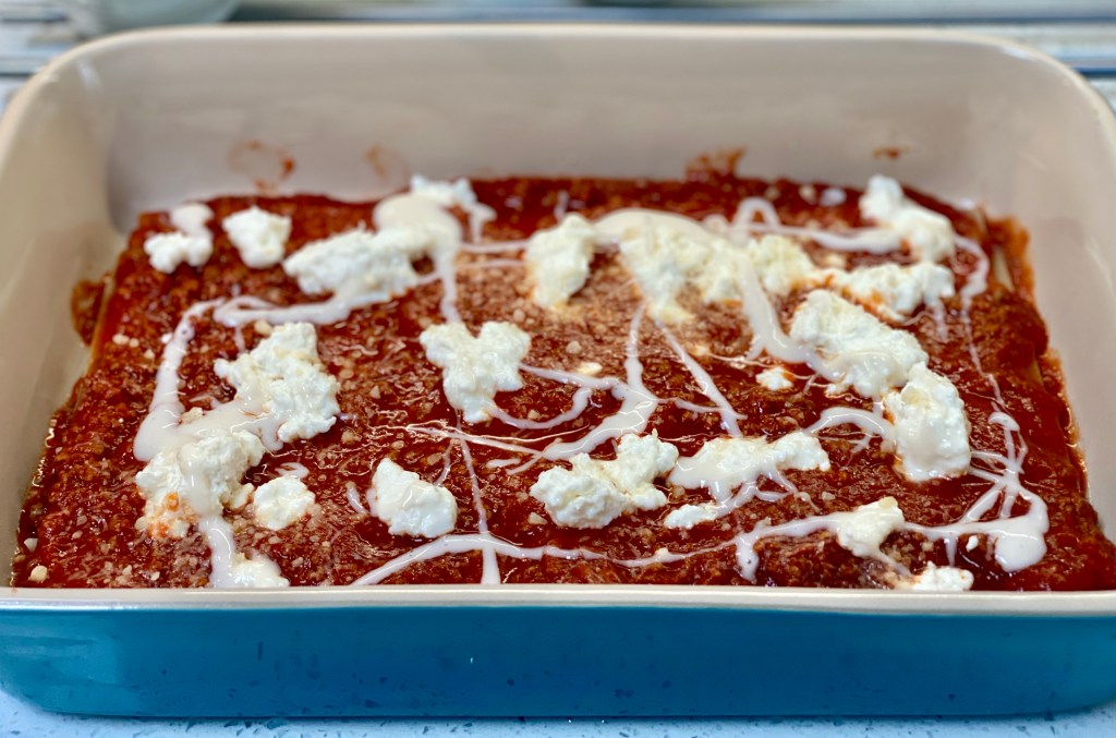 - Cover it with bolognese sauce, ricotta cheese, grated parmigiano cheese and béchamel sauce.