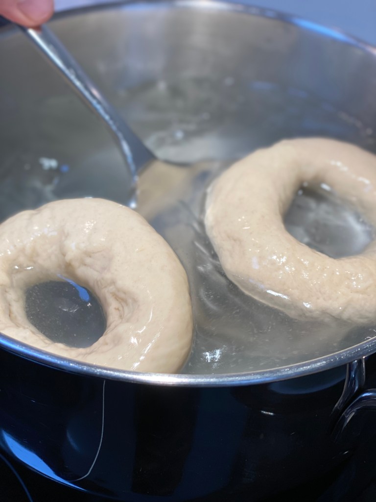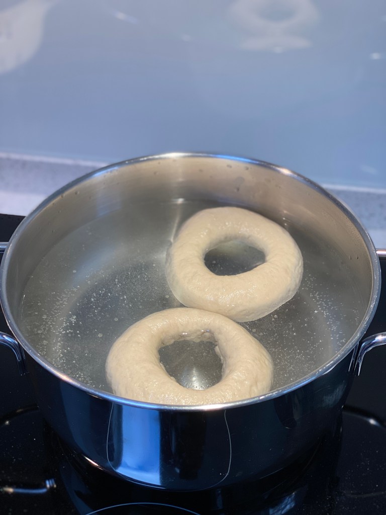 7. Heat up a large pot with the water, bring it to simmer, add the sugar and lower the heat to a minimum. When water is hot but not boiling, add the bagels and poach them for approximately 20 seconds on each side.
