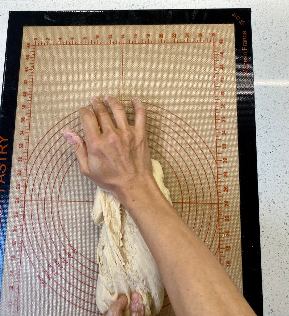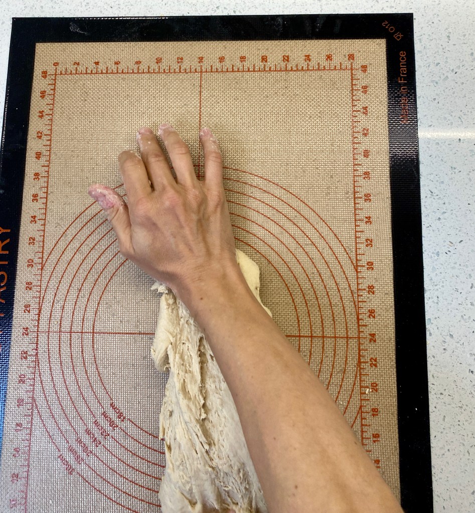 When working the dough, use the back of your palm, push out the dough before pulling back in again like in the pictures below.