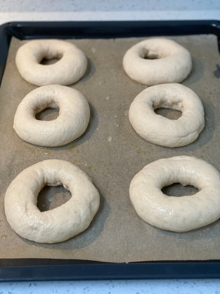 5. Place the bagels on a lined and oiled baking tray, evenly spaced, and let them rest for ten minutes.