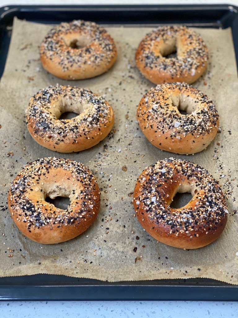Bagels are great when eating fresh on the day of baking as they get hard and gummy relatively quickly. You can store them in an air-tight container for a day or two but if you are not eating all the bagels on the day you bake them, then I would recommend freezing them once cold. They freeze very well, just take them out and let them defrost at room temperature when ready to have your next bagel.
