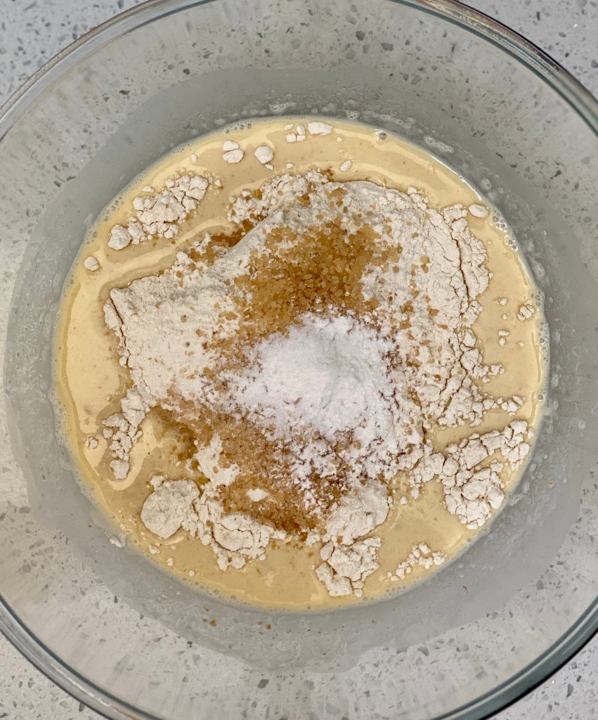 3. Add the flour, baking soda, salt and sugar and combine well using a whisk until there are no lumps and you have a smooth batter.